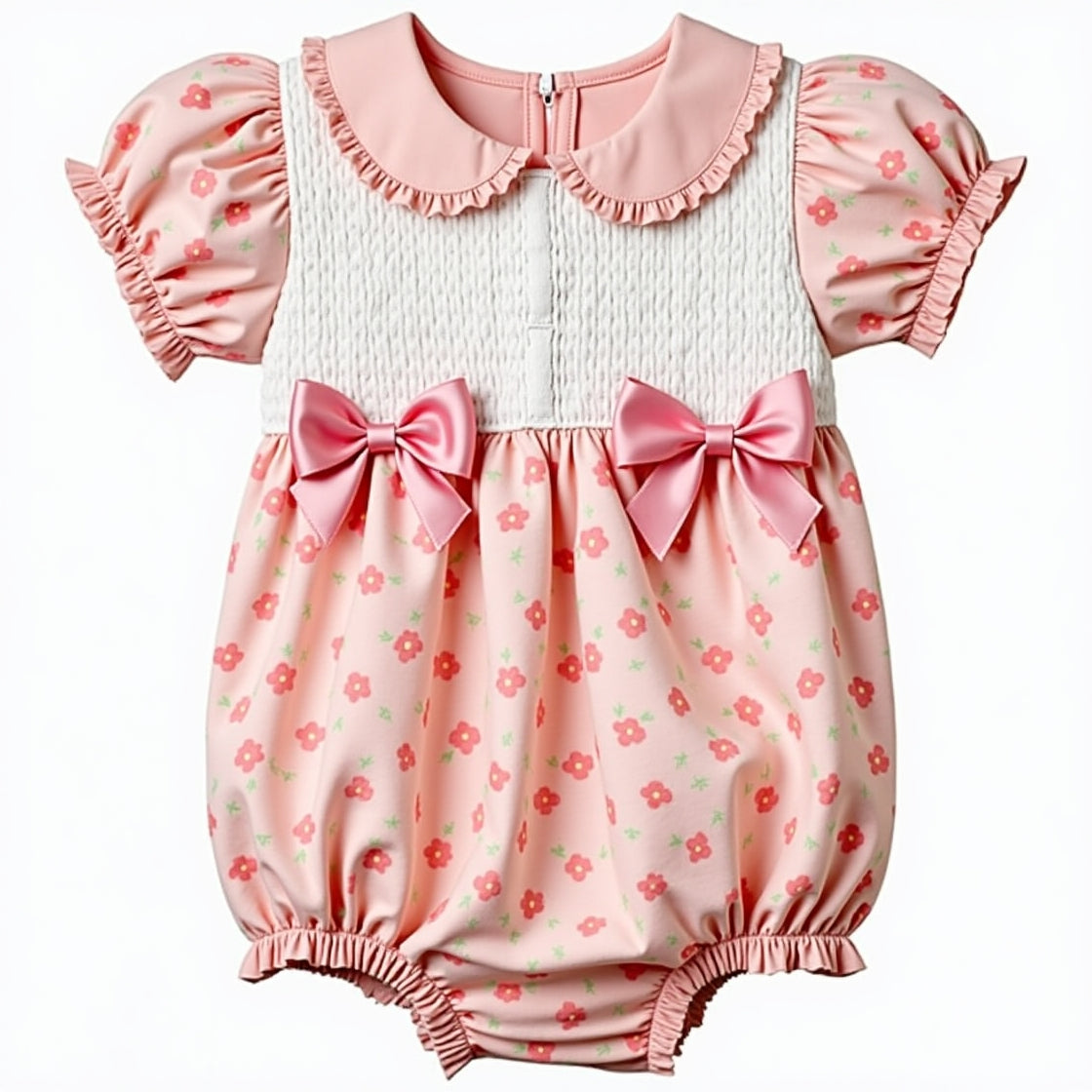 A delightful vintage-inspired baby romper designed for charm and comfort. This one-piece outfit features: